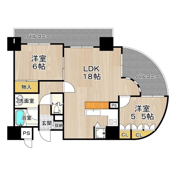 57.91㎡超の2LDKで、リビングも広々。