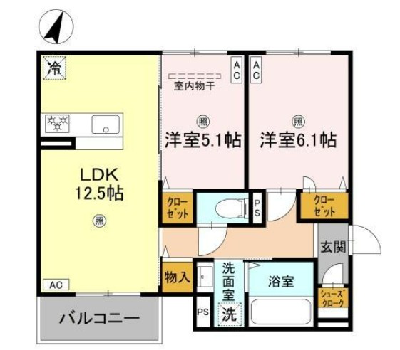 リビング12.5帖+洋室6.1帖+洋室5.1帖の広々設計で、